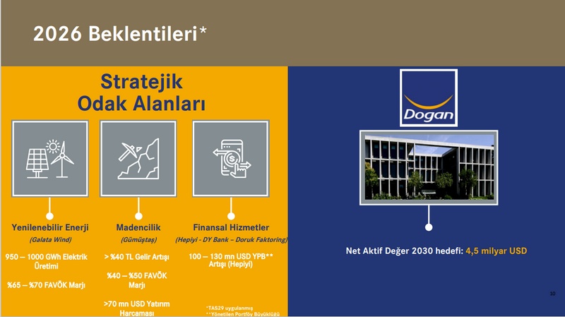 2026 yılında odağımız finansal performansın sürdürülebilir şekilde artışı olacaktır. Güçlenen bilançomuz, artan operasyonel disiplinimiz ve daha öngörülebilir kazanç profilimizle, yolculuğumuzun bir sonraki aşamasına artan bir güvenle giriyoruz; bu doğrultuda 2030 yılı Net Aktif Değer beklentimizi 4,0 milyar ABD dolarından 4,5 milyar ABD dolarına yükseltiyoruz. (2025/12 Sonuçlarına İlişkin Yatırımcı Bülteni)