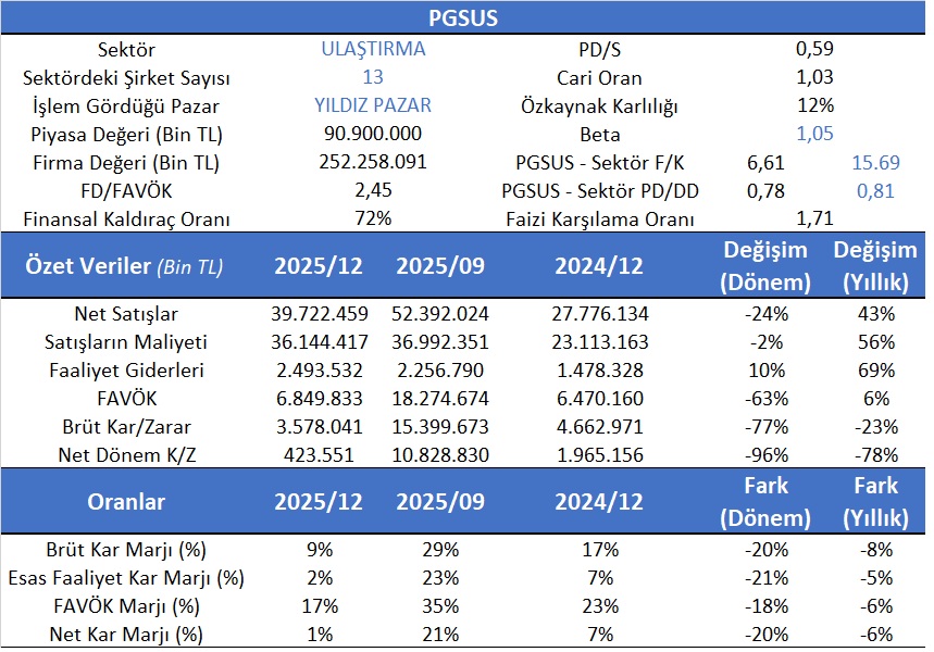 PGSUS’un son çeyrek 2025/4 verileri incelendiğinde sektör F/K oranın15,69 olmasına karşılık 6,61 bir F/K’ya sektör PD/DD oranın 0,81 olmasına karşılık 0,78’lik bir PD/DD sahip olduğu gözlenmekte olup ucuz kaldığının bir göstergesidir. Ayrıca Aswath Damodaran Avrupa bölgesindeki havayolu şirketlerinin ortalama fiyat kazanç oranının 17,27 ve beklenen F/K oranın ise 10,37 olarak tahmin edilmesi ile yine PD/DD oranı Avrupa şirketleri ortalaması 1,81 olup PGSUS alım bölgesindedir.