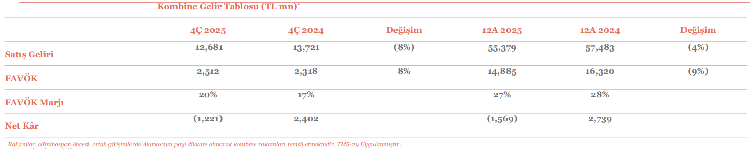 FAVÖK 2025 yılı 4. Çeyreğinde -1.059 milyon TL olarak gerçekleşti. FAVÖK marjı ise 4. çeyrekte geçen yılın aynı çeyreğine göre 122,60 puan artışla %-62,30 oldu. Bir önceki çeyrekte FAVÖK marjı %21,11 seviyesindeydi. Çeyreklik bazda FAVÖK marjında -83,41 puan azalış gerçekleşti. Kombine FAVÖK, 2025 yılının dördüncü çeyreğinde 2,5 milyar TL olarak gerçekleşirken, FAVÖK marjı %20 seviyesinde gerçekleşti.