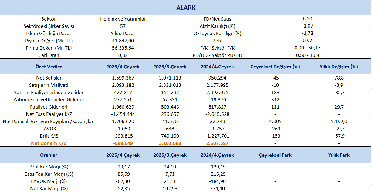 Alarko Holding (ALARK), 2025 yılı 4.çeyreğinde 889.649 milyon TL net zarar (ana ortaklık) açıkladı. Bir önceki çeyreğe kıyasla kardan zarara geçiş dikkat çekti. 2025 yılının dördüncü çeyreğinde, kombine net zarar 1,2 milyar TL olarak kaydedilirken, bu rakam bir önceki yılın dördüncü çeyreğinde 2,4 milyar TL kar olarak gerçekleşmişti. Zararda en etkili faktörler, enerji segmentinde üretim düşüşleri, arazi geliştirme ve turizm iş kollarındaki yüksek maliyet ve düşük karlılık, sanayi ve ticaret segmentinde artan operasyonel giderler ile tarım segmentindeki yatırım ve FAVÖK baskıları olarak öne çıktı.