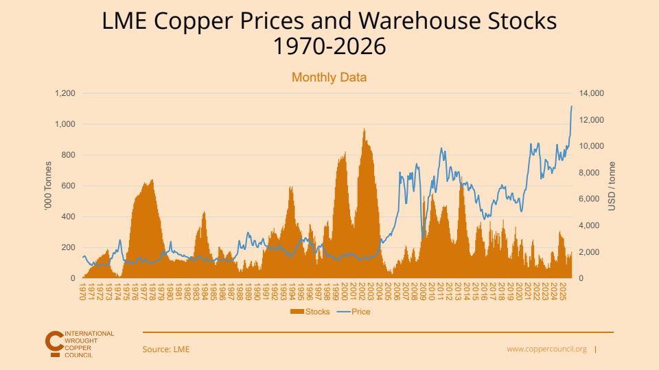 Şekil: LME bakır fiyatları ve depo stoklarının tarihsel seyri (1970–2026)