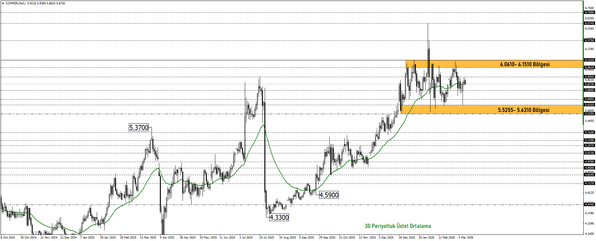 Bakır fiyatları yılbaşından bu yana tüm zamanların zirve seviyelerine yakın bir bölgede yatay bir bant içerisinde hareket etmektedir. Küresel piyasalarda jeopolitik gelişmeler, enerji fiyatları ve dolar hareketleri fiyatlamalarda belirleyici olurken teknik olarak 5,5255–6,1510 geniş bant aralığı kısa vadeli yön açısından kritik görünmektedir. Bu nedenle fiyatların bant kırılımı gerçekleşene kadar yatay ve oynak bir seyir izleme olasılığı yüksek görünmektedir.