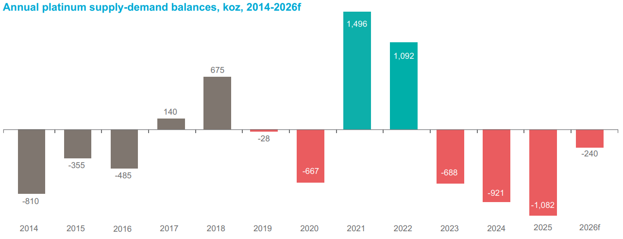 Şekil: Küresel platin arz–talep dengesi (2014–2026)