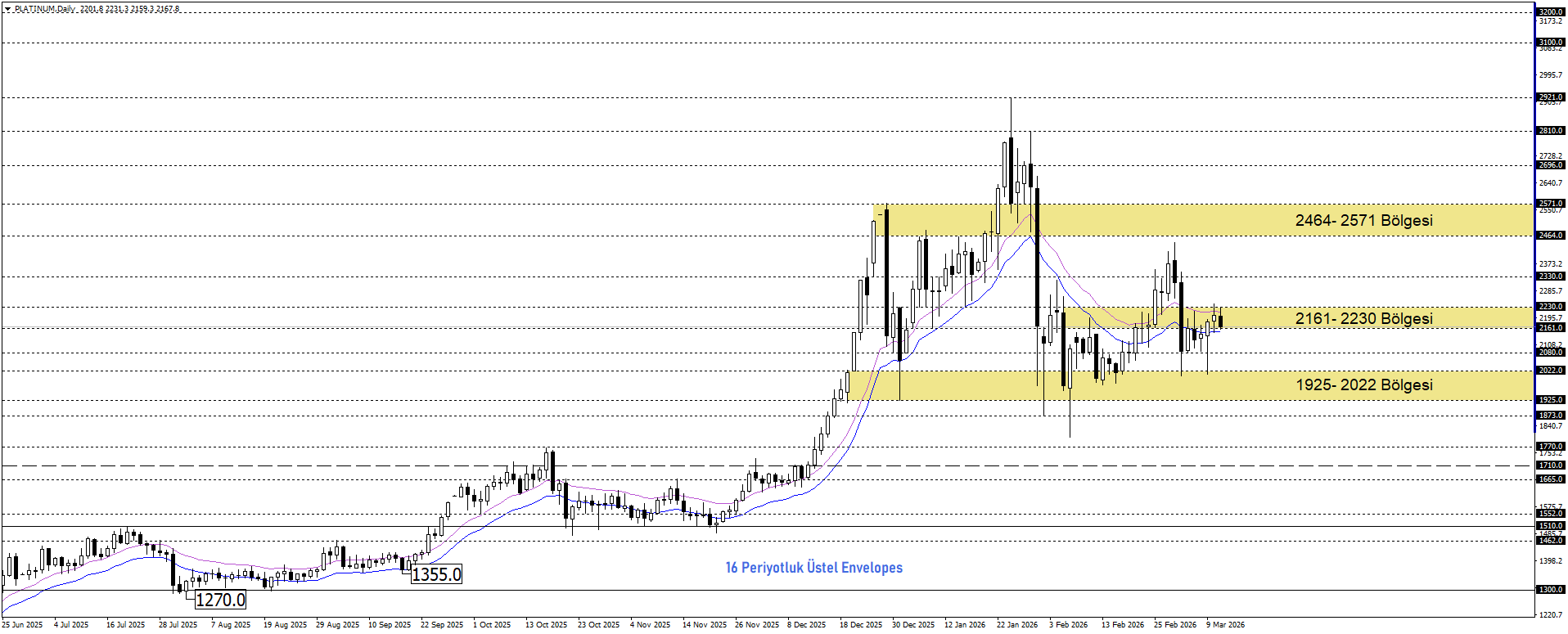 2921 seviyesinde zirve oluşturan platin fiyatları, ardından gelen geri çekilme ile birlikte 16 periyotluk Envelopes göstergesi ve 2161–2230 destek bölgesini test etmektedir. Fiyatların halen düzeltme bölgesinde bulunması nedeniyle Envelopes (16) ile 2161–2230 bandı kısa vadede kritik bir eşik olarak öne çıkmaktadır.