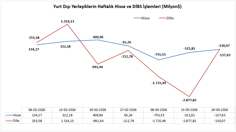 16 – 20 Mart haftasında yurt dışında yerleşik kişilerin piyasa fiyatı ve kur hareketlerinden arındırılmış hisse senetleri net değişimi -137 milyon 630 bin dolar olarak gerçekleşirken yurt dışında yerleşik kişilerin piyasa fiyatı ve kur hareketlerinden arındırılmış DİBS (Kesin Alım) net değişimi -130 milyon 070 bin dolar olarak gerçekleşti.