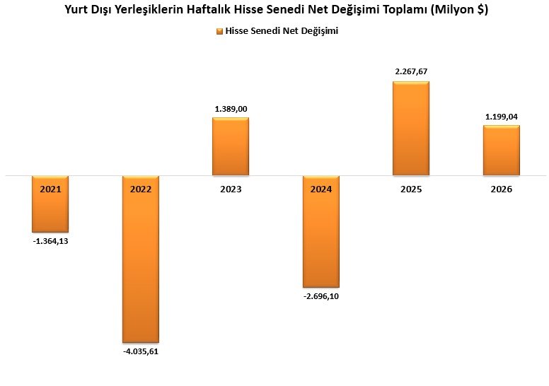 Yıllık bazda hisse senedi net değişimlerine ayrıca bakıldığında, yabancı yatırımcıların 2021 ve 2022 yıllarında hisse senetlerinde net satım gerçekleştirdiği, 2023 yılında ise alım tarafında yer aldığı görülmektedir. 2024 yılı da 2021 ve 2022’ye benzer şekilde net satımla negatif tarafta tamamlanmıştır. 2025 yılında ise dikkat çekici bir artışla yabancı yatırımcıların yeniden alım tarafında yer aldığı görülmektedir. Diğer yandan, 2026 yılının başından itibaren 20 Mart ile biten hafta itibarıyla hisse senetlerinde 1,19 milyar dolar tutarında alım gerçekleştiği izlenmektedir.