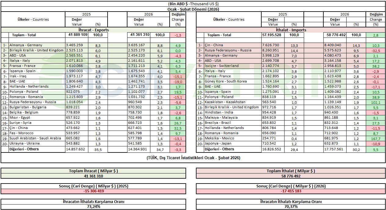 TÜİK’in her ayın sonunda açıklamış olduğu Dış Ticaret İstatistikleri’ne göre Ocak – Şubat 2026 döneminde en çok ihracat ve ithalat yapılan 20 ülke aşağıdaki tabloda belirtilmiştir.