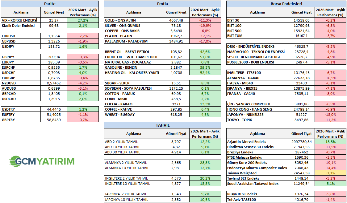 Mart ayı boyunca jeopolitik risklerin piyasa davranışları üzerindeki etkisi hissedilmiş; risk iştahındaki dalgalanmalar hisse senetleri üzerinde baskı yaratırken, enerji fiyatlarındaki yükseliş şirketler açısından maliyet unsuru olarak öne çıkmıştır. Bu dönemde faiz artırım beklentilerinin güçlenmesi ise değerli metaller üzerinde baskı oluşturmuş, altın başta olmak üzere kıymetli madenlerde yukarı yönlü hareketler sınırlı kalmıştır.