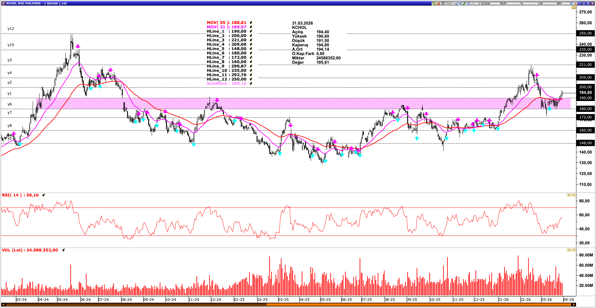 Şubat ortasında 221 TL zirvesine ulaştıktan sonra gerçekleşen düşüşler dikkat çekerken, ilgili baskının 180 - 190 bölgesi ile sınırlanma çabası ve bu bölge içerisinde yer alan 21 ve 55 günlük üstel hareketli ortalamalar üzerinde sergilediği günlük kapanışların şirkete yönelik yeni ay görünümünde iyimser beklentilerin gündemimizi meşgul etmesine olanak tanımıştır. Bu açıdan ilgili ortalamaların yer aldığı 180 - 190 bölgesi üzerinde kaldığı müddetçe önce Şubat 2026 (221 TL) daha sonra da Mayıs 2024 (249 TL) zirvelerine doğru olası trend yolculuğu ön plandadır. 200 TL seviyesi de mevcut yükselişlerde kısa vadeli takip edilecek ara bölge olarak izah edilebilir.