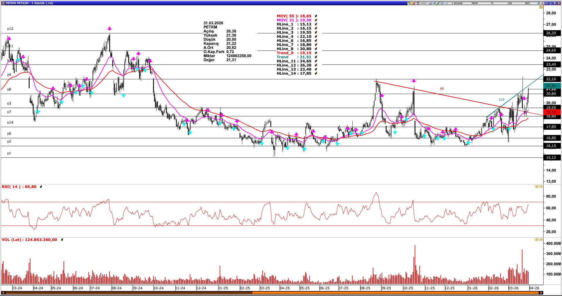 2025 Ağustos döneminde zirve olarak kabul ettiği 22,10 TL seviyesini Mart ayında tekrar test eden ve ilgili bölgeden önemli bir geri çekilme kaydeden PETKM, ilgili geri çekilmeye karşın hem sonlandırdığı trend bölgesi hem de 21 ve 55 günlük üstel hareketli ortalamalar üzerindeki seyrini sürdürmektedir. Bu düşünce şirkete yönelik yeni ay görünümünde iyimser beklentilerin gündemimizi meşgul etmesine olanak tanımıştır. O halde ilgili ortalamaların yer aldığı 18,50 - 19,20 bölgesi üzerinde kaldığı müddetçe 2024 Temmuz zirve seviyesine (26,20 TL) doğru olası trend yolculuğu ön plandadır. 22,10 TL seviyesi de mevcut yükselişlerde kısa vadeli takip edilecek ara bölge olarak izah edilebilir.
