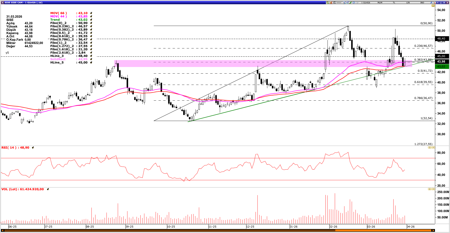 Şubat ortasında zirve olarak kabul edilen 50,90 TL seviyesine Mart ayında önemli oranda yaklaşan ancak ilgili bölge üzerinde reaksiyon gösteremediği için baskıya maruz kalan SISE, ilgili geri çekilmeye karşın hem pozitif trend bölgesi hem de trendi destekleyen 44 ve 66 günlük üstel hareketli ortalamalar üzerindeki seyrini sürdürmektedir. Bu düşünce şirkete yönelik yeni ay görünümünde iyimser beklentilerin gündemimizi meşgul etmesine olanak tanımıştır. O halde ilgili ortalamaların yer aldığı 42,00 - 43,00 bölgesi üzerinde kaldığı müddetçe zirve seviyesine doğru olası trend yolculuğu ön plandadır. 45,00 TL seviyesi de mevcut yükselişlerde kısa vadeli takip edilecek ara bölge olarak izah edilebilir.