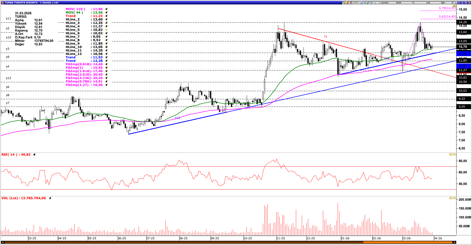 2025 Kasım döneminde zirve olarak kabul ettiği 14,17 TL seviyesini Mart ayında tekrar test eden TURSG, ilgili bölge üzerinde kalıcı reaksiyon sergileyemediği için baskı gördü ancak bu baskıya karşın hem yükseliş trendi hem de trendi destekleyen 44 günlük üstel hareketli ortalama üzerindeki hareketi ile dikkat çekmektedir. Bu düşünce şirkete yönelik yeni ay görünümünde sınırlı baskı / trend iyimserliği senaryosunun gündemimizi meşgul etmesine olanak tanımıştır. Teknik açıdan 44 ve 110 günlük ortalamaların yer aldığı 12,55 - 11,95 bölgesi önemli olmakla birlikte TURSG ilgili ortalamalar üzerinde 2025 Kasım ve 2026 Mart döneminde test ettiği 14,20 zirvesine doğru yeni bir yolculuk izleyebilir hatta yeni zirve seviyelerini de trend yolculuğunda kaydetmek isteyebilir.. Bu yolculukta 13,05 seviyesi de mevcut yükselişlerde kısa vadeli takip edilecek ara bölge olarak izah edilebilir.