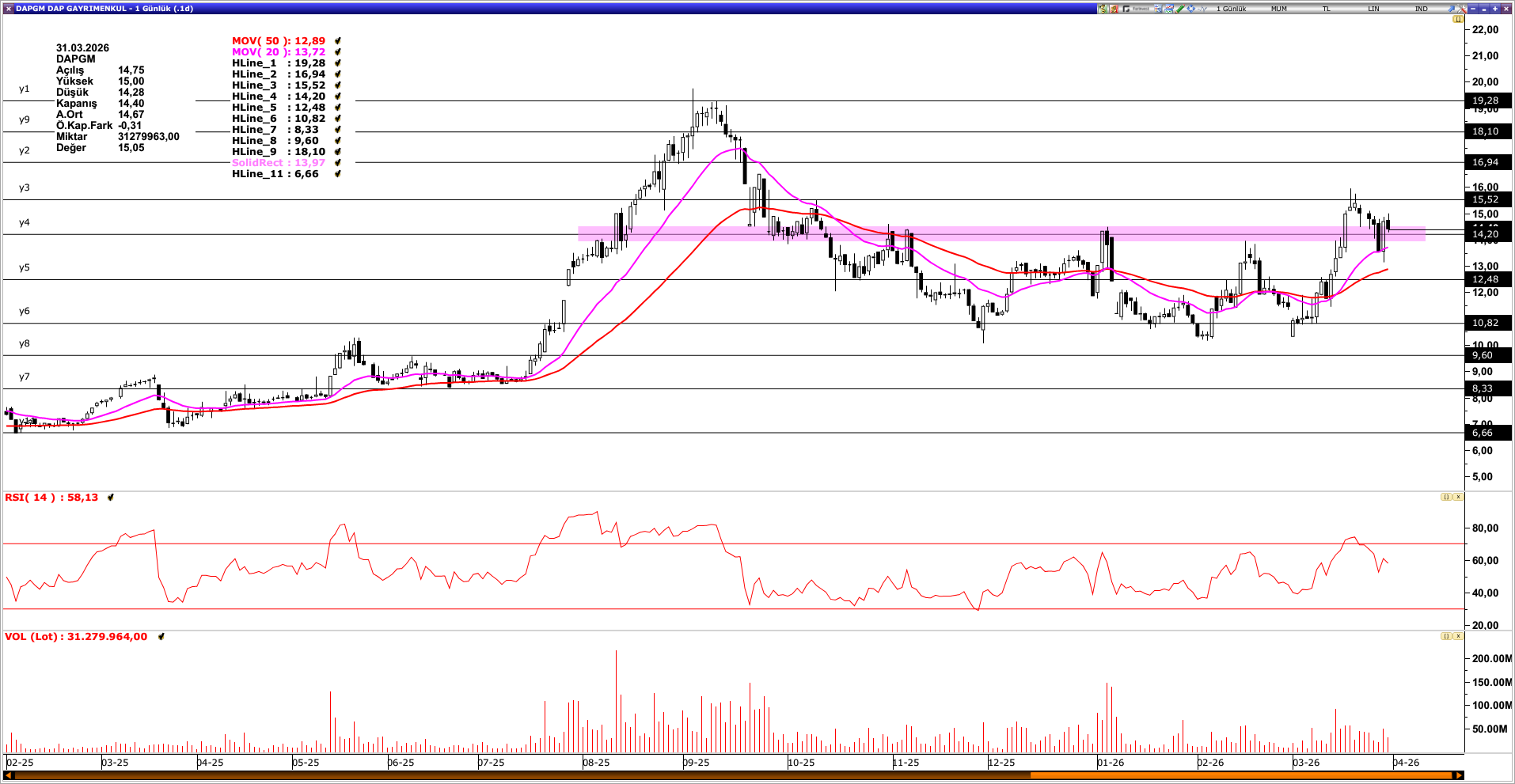 ABD ile İsrail'in İran’a düzenlediği saldırıda 1 ayı geride bırakırken endeks ve şirket performansları yerelden küresele kadar önemli dalgalanma eğilimleri gösterdi. Özellikle sektör ve şirketlerin sergilediği geri çekilmeler bu süreçte dikkat çekti. DAPGM şirketi bu olumsuz sürece karşın sergilediği yükselişlerle önemli bir potansiyel sundu. Son süreçteki tepki düşüncesini 20 ve 50 günlük ortalamalar ile sınırlı tutan şirkete yönelik iyimser tavır devam etmektedir. Bu açıdan yeni ay görünümünde şirkete yönelik pozitif beklentimiz ön plandadır. Teknik açıdan 20 ve 50 günlük ortalamaların yer aldığı 12,80 - 13,70 bölgesi önemli olmakla birlikte DAPGM ilgili ortalamalar üzerinde 2025 Eylül döneminde test ettiği 19,75 zirvesine doğru olası yolculuğuna devam etmek isteyebilir. Bu yolculukta 15,52 seviyesi kısa vadeli takip edilecek ara bölge olarak izah edilebilir.