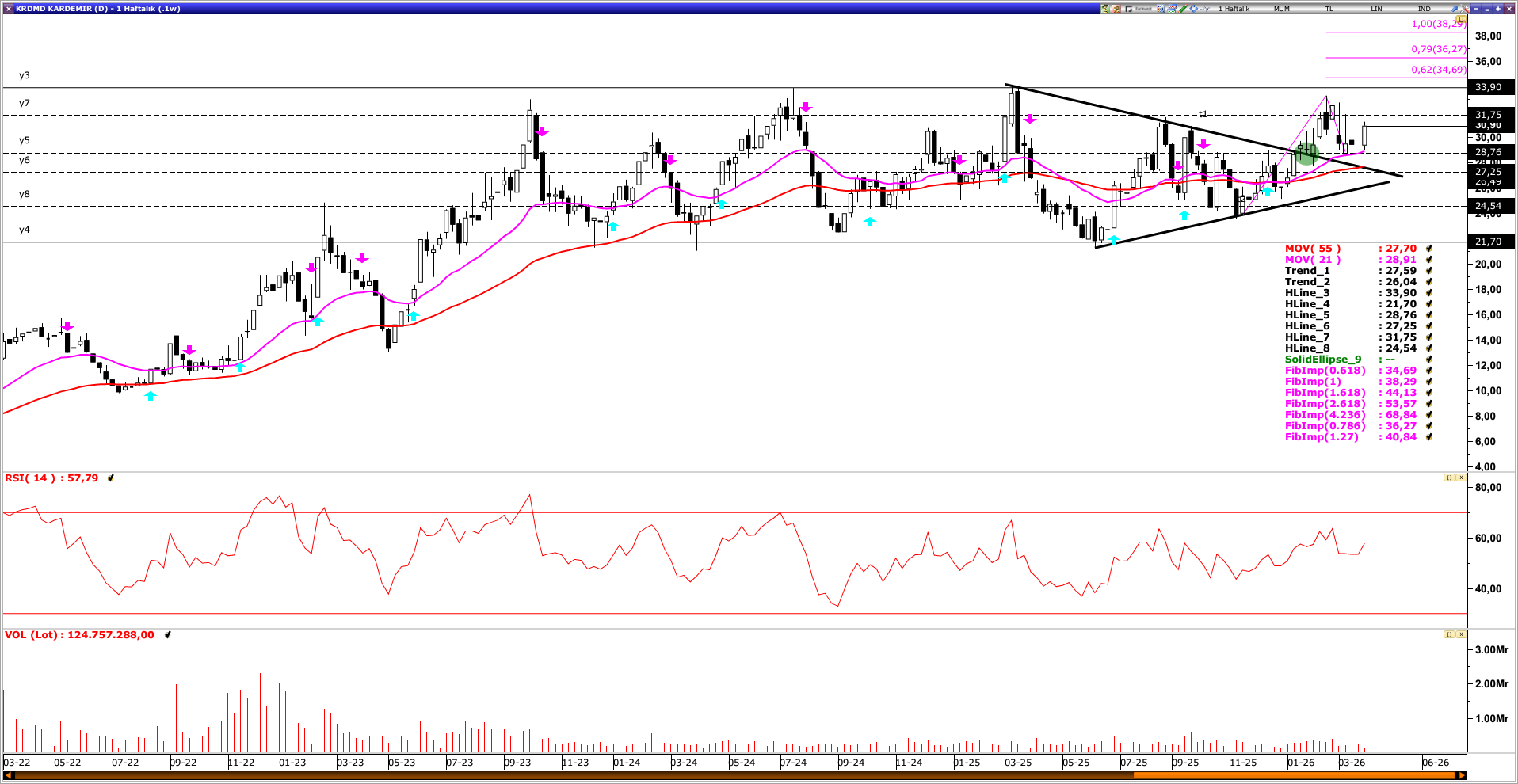 2025 Mart döneminde zirve olarak kabul ettiği 33,90 TL seviyesine 2026 Şubat döneminde yaklaşan ve ilgili bölge üzerinde kalıcı reaksiyon gerçekleştiremediği için baskı gören KRDMD, ilgili geri çekilmeye karşın hem sonlandırdığı trend bölgesi hem de 21 haftalık üstel hareketli ortalama üzerindeki seyrini sürdürmektedir. Bu düşünce, şirkete yönelik yeni ay görünümünde iyimser beklentilerin oluşmasını sağlamıştır. Teknik açıdan 21 ve 55 haftalık ortalamaların yer aldığı 27,70 - 28,90 bölgesi önemli olmakla birlikte şirket ilgili bölge üzerinde kaldığı müddetçe zirve seviyesine doğru trend yolculuğunu sürdürmek ve yeni zirve seviyelerine doğru da hareket akışını güçlendirmek isteyebilir. 31,65 TL seviyesi de mevcut yükselişlerde kısa vadeli takip edilecek ara bölge olarak izah edilebilir.