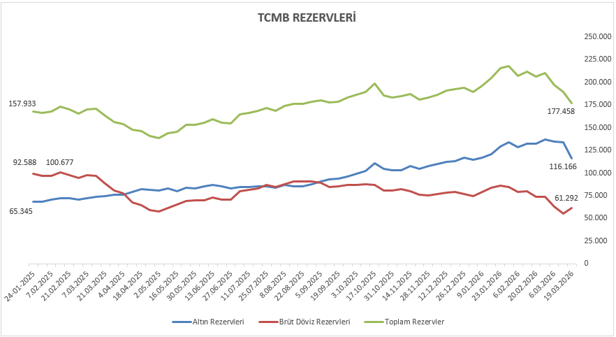 Yılın başından 19 Mart haftasına kadar olan dönemde TCMB rezervlerinde bir miktar geri çekilme yaşandı. Son haftalarda jeopolitik gelişmelerin etkisiyle bu görünümde yeniden zayıflama dikkat çekti. Özellikle Orta Doğu kaynaklı artan belirsizlikler ve küresel piyasalarda risk iştahındaki dalgalanma, altın fiyatlarındaki oynaklıkla birlikte TCMB’nin altın rezervlerinde ve buna bağlı olarak toplam rezervlerde geri çekilmeye yol açtı.