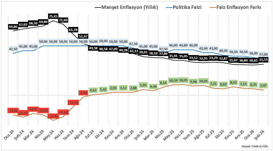 TÜİK tarafından açıklanan Şubat ayı enflasyon verisi, dezenflasyon sürecinin devam ettiğini ancak fiyatlama davranışlarında katılığın sürdüğünü ortaya koydu. TÜFE, Şubat ayında aylık %2,96 artarken yıllık bazda %31,53 seviyesinde gerçekleşti. Yıl başından bu yana artış %7,95 olurken, on iki aylık ortalamalara göre enflasyon %33,39 oldu. Alt kalemlerde özellikle gıda grubundaki %36,44’lük yıllık artış dikkat çekerken, işlenmemiş gıda fiyatlarındaki oynaklık manşet enflasyon üzerinde belirleyici olmaya devam etti. Hizmet enflasyonundaki katılık ise genel görünümde yukarı yönlü riskleri canlı tutarken, mal grubunda görece daha ılımlı bir seyir izlendi.