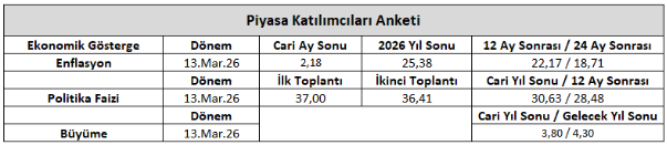 Mart ayı sonuçlarına baktığımızda, enflasyon tarafında yukarı yönlü bir güncelleme öne çıkıyor. 2026 yıl sonu TÜFE beklentisinin %24,11’den %25,38’e yükselmesi, enflasyonla mücadele sürecinin beklenenden biraz daha zaman alabileceğine işaret ediyor. Kısa vadeli beklentilerde de benzer bir eğilim söz konusu.