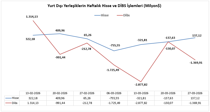 23 – 27 Mart haftasında yurt dışında yerleşik kişilerin piyasa fiyatı ve kur hareketlerinden arındırılmış hisse senetleri net değişimi 137 milyon 120 bin dolar olarak gerçekleşirken yurt dışında yerleşik kişilerin piyasa fiyatı ve kur hareketlerinden arındırılmış DİBS (Kesin Alım) net değişimi -1 milyar 369 milyon 910 bin dolar olarak gerçekleşti.