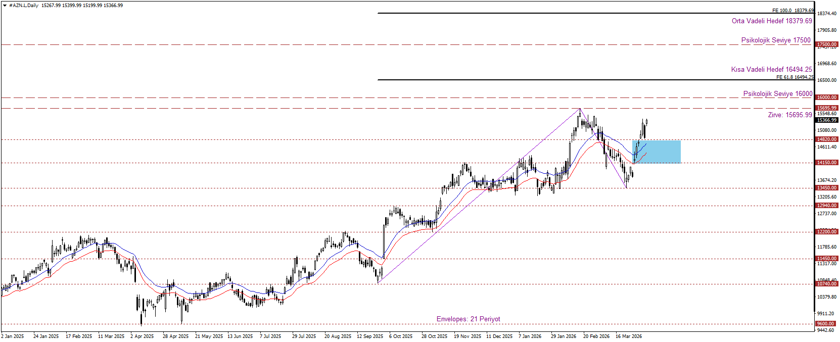 AstraZeneca hissesi, genel yükseliş eğilimini koruyarak pozitif teknik görünümünü sürdürmektedir. Fiyatlamaların 14.150–14.820 bölgesi üzerinde kalıcılık sağlaması bu görünüm açısından kritik önem taşırken, hisse Fibonacci uzantı seviyelerini takip ederek kısa vadede 16.494 ve orta vadede 18.379 seviyelerine yönelik yukarı yönlü potansiyelini koruyabilir. Takip edilen bölgenin altına inilmesi durumunda ise satış baskısı artabilir ve hisse 13.450 seviyesine geri çekilme eğilimi gösterebilir.
