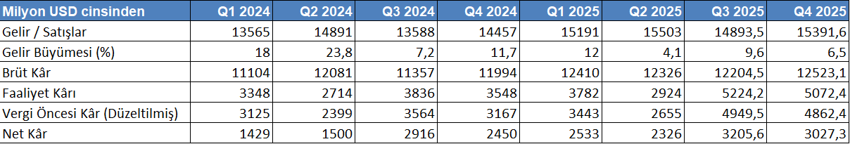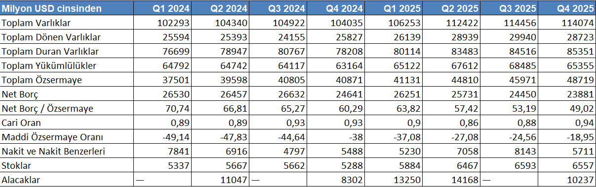 Şirketin bilançosu büyüme odaklı ancak kontrollü bir yapı sunmaktadır. Toplam varlıkların istikrarlı bir düzlemde 114 milyar USD’ye yükselmesi, ölçek büyümesini yansıtmaktadır.