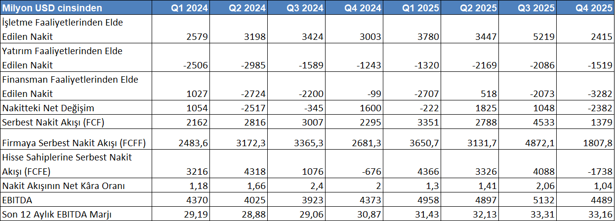 Serbest nakit akışındaki volatilite, nakit üretim kalitesinin sürdürülebilirliği konusunda belirsizlik yaratmaktadır. Özellikle bazı dönemlerde negatif FCFE görülmesi, hissedar değeri yaratımının sürekliliğini sorgulatmaktadır.