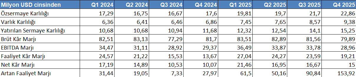 Ancak marj tarafında dalgalı bir yapı dikkat çekmektedir. Faaliyet ve FAVÖK (EBITDA) marjlarındaki oynaklık, maliyet kontrolünün dönemsel olarak zayıfladığını göstermektedir. Net kar marjındaki benzer dalgalanmalar, karlılık kalitesinin tam anlamıyla stabil olmadığını ortaya koymaktadır.