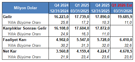 Buradan hareketle Bloomberg tarafından hazırlanan, Morgan Stanley’in 2026 yılı birinci çeyreklik finansallarına yönelik beklenti anketini incelediğimizde;