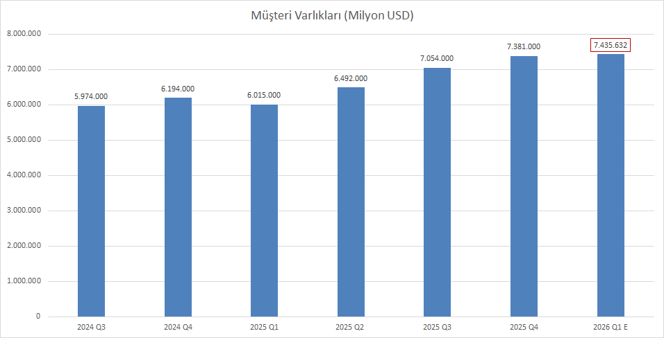 Morgan Stanley’in müşterileri banka nezdinde 7,3 trilyon dolar varlık tutuyor. Müşteri varlıkları yıllık bazda %19 oranında büyüme gösterirken; piyasa bu tutarın 2026 yılı ilk çeyreğinde %23 oranında büyümeyle 7,4 trilyon doları aşmasını bekliyor.