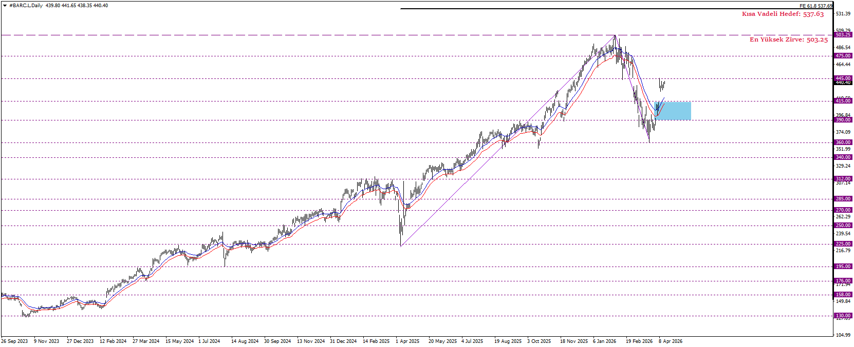 Barclays hissesi, genel yükseliş eğilimini koruyarak teknik açıdan pozitif görünümünü sürdürmektedir. Fiyatlamaların 390–415 bölgesi üzerinde kalıcılık devam ettikçe, mevcut yukarı yönlü trendin devamı açısından kritik eşik olarak öne çıkarken, bu bölge üzerindeki seyir momentumun korunmasına ve alıcı iştahının canlı kalmasına işaret etmektedir. Bu senaryoda hisse, Fibonacci uzatma projeksiyonu doğrultusunda kısa vadede 537 seviyesine yönelik yükseliş potansiyelini korumaktadır. Öte yandan, 390–415 bölgesinin altına sarkılması durumunda teknik görünüm zayıflayarak satış baskısının artması beklenebilir ve bu durumda hisse fiyatında 360 seviyesine doğru bir düzeltme hareketi gündeme gelebilir.