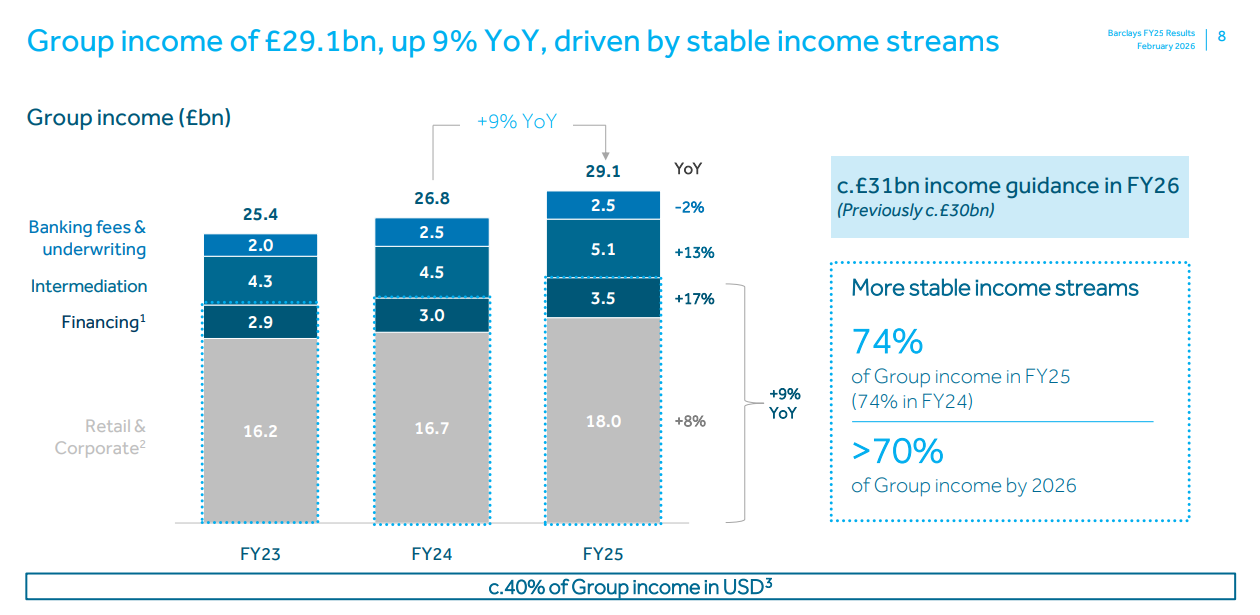 Barclays’in grup geliri 2025 yılında %9 artarak 29,1 milyar sterlin seviyesine yükselmiştir. Bu büyümeye perakende ve kurumsal bankacılık faaliyetleri 18,0 milyar sterlin ile %8 artışla katkı sağlarken, aracılık faaliyetleri 5,1 milyar sterlin ile %13 artış, finansman faaliyetleri ise 3,5 milyar sterlin ile %17 artış göstererek önemli destek sağlamıştır. Grup gelirinin %74’ü daha istikrarlı ve öngörülebilir gelir kaynaklarından oluşmaya devam etmiş, bu oran 2024 seviyesiyle uyumlu kalmıştır ve 2026 yılında %70’in üzerinde tutulması hedeflenmektedir. Ayrıca toplam gelirin yaklaşık %40’ı Amerikan doları cinsinden elde edilerek döviz bazlı çeşitlilik güçlendirilmiştir.