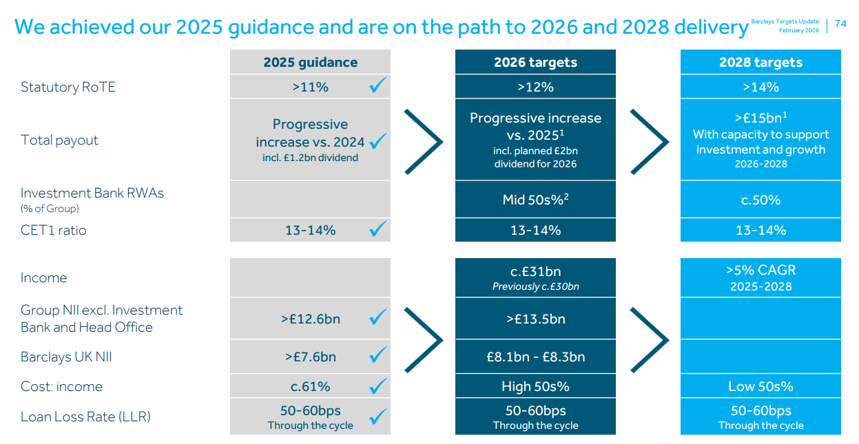 Barclays, 2025’teki güçlü performansın ardından 2026–2028 dönemine daha iddialı bir büyüme ve kârlılık hedefiyle girmektedir. 2026 itibarıyla Statüter RoTE’nin %12’nin üzerine çıkarılması, toplam gelirin yaklaşık 31 milyar sterlin seviyesine yükselmesi ve Barclays UK Net Faiz Geliri’nin 8,1–8,3 milyar sterlin aralığında gerçekleşmesi hedeflenmektedir. Ayrıca hissedarlara yapılan toplam geri dönüşün de kademeli olarak artırılması planlanmaktadır.
