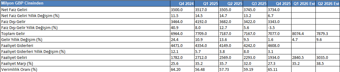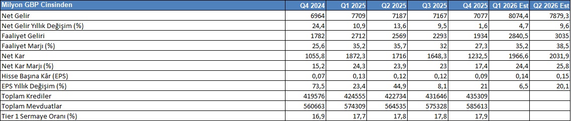 Barclays’in 4Ç25 sonuçları, yıl genelindeki güçlü büyümenin ardından gelir tarafında belirgin bir yavaşlama ve karlılıkta sıkışma görünümüne işaret etmektedir. Net gelir artışının %1,6 seviyesine gerilemesi, önceki dönemlerdeki güçlü büyümenin ardından özellikle işlem ve ücret gelirlerinde normalleşmeyi yansıtmaktadır. Aynı dönemde karlılık marjlarının gerilemesi, yüksek maliyet tabanının sürdüğünü ve operasyonel kaldıraç etkisinin zayıfladığını göstermektedir. Buna karşın bilanço tarafında güçlü yapı korunmakta; kredi hacmi ve mevduat tabanı büyümeye devam ederken sermaye yeterlilik oranındaki artış bankanın risk taşıma kapasitesini desteklemektedir. 2026 başlangıcına ilişkin beklentiler ise zayıf bazın ardından gelir ve karlılıkta toparlanma, marjlarda normalleşme ve buna bağlı olarak yeniden değerleme potansiyelinin öne çıktığı bir görünüm sunmaktadır.