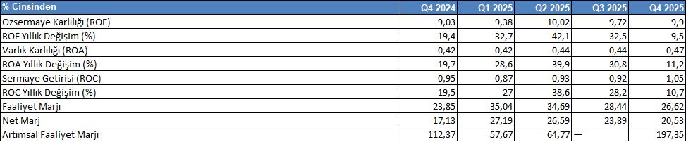 Barclays’ın 2025 dördüncü çeyrek karlılık metrikleri, genel olarak yatay-pozitif bir trendle birlikte sınırlı iyileşmeye işaret etmektedir. ROE Q4 2024’te %9,03 seviyesinden %9,9’a yükselirken, yıl içindeki çeyreksel hareketler dalgalı bir seyir izlemekle birlikte genel olarak stabil bir bantta kalmıştır. ROA %0,47 seviyesine çıkarak varlık krlılığında kademeli bir iyileşmeye işaret ederken, ROC(Sermaye Getirisi) %1,05 seviyesinde sermaye verimliliğinin korunduğunu göstermektedir. Net ve faaliyet marjlarının sırasıyla %20,53 ve %26,62 seviyelerinde gerçekleşmesi, karlılık yapısının büyük ölçüde stabil kaldığını ortaya koymaktadır. Genel resim, güçlü bir ivmeden ziyade kontrollü ve dengeli bir karlılık profiline işaret etmekte olup, 2026 RoTE hedefi açısından iyileşme alanının daha çok verimlilik ve gelir bileşimi optimizasyonuna bağlı olduğunu göstermektedir.
