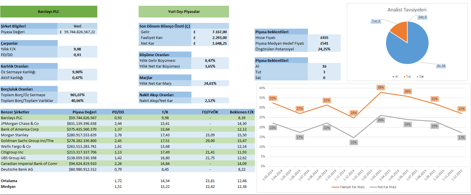 Genel olarak Barclays, 2025 itibarıyla güçlü sermaye yapısı ve kontrollü risk profiliyle dayanıklı bir finansal görünüm sergilemekle birlikte, gelir momentumundaki normalleşme ve artan maliyet baskıları nedeniyle karlılıkta sınırlı bir baskı yaşamaktadır. Bununla birlikte, çeşitlendirilmiş gelir yapısı ve güçlü net faiz geliri üretimi bilanço stabilitesini desteklerken, RoTE hedeflerine ulaşım açısından temel belirleyici unsurun operasyonel verimlilik ve gelir kompozisyonundaki iyileşme olacağı değerlendirilmektedir. Orta vadede kademeli toparlanma potansiyeli korunmakla birlikte, değer yaratımının sürdürülebilirliği maliyet disiplini ve sermaye verimliliğine bağlı kalmaya devam etmektedir.