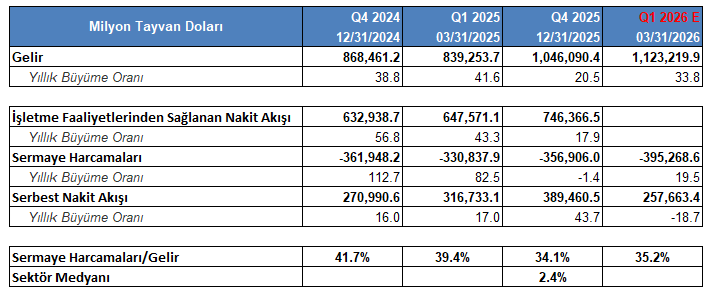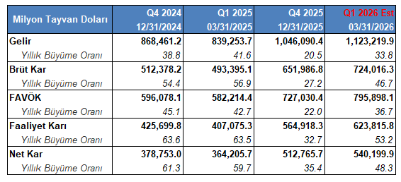 Buradan, şirketin 2026 yılı birinci çeyreklik dönemde sunacağı bilançoya dair piyasa beklentilerini ele alan Bloomberg anketini incelersek;