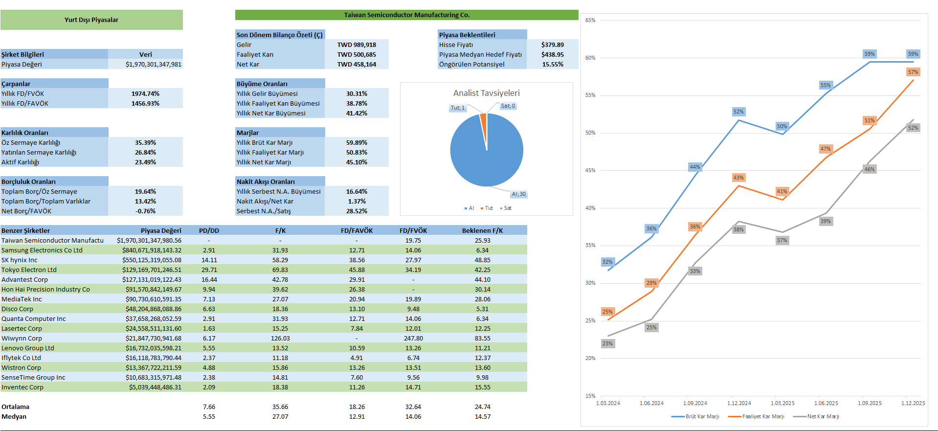 TSM, hem operasyonel hem finansal açıdan sağlıklı konumunu korurken, rekabet açısından pozitif yönde etkilenmeye devam ediyor. Şirketin yükselen marjları, güçlü nakit üretimi ve yüksek teknolojideki hakimiyetiyle yapay zeka trendinin ana faydalanıcısı olmaya devam ettiği ifade edilebilir. Bu yapıyla şirket benzerlerine kıyasla yüksek çarpanlara sahip. İlerleyen dönemlerde yapay zeka harcamaları ve talebine dair dinamikler izlenmeye devam edecek gibi gözüküyor.