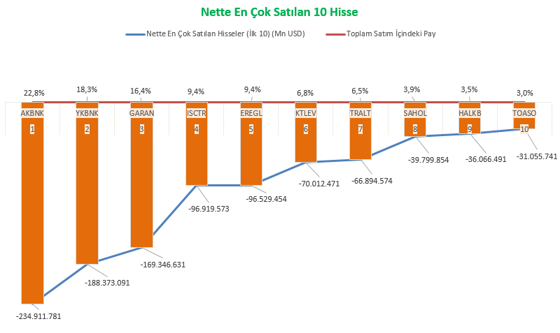 Mart ayında yabancıların net satım işlemleri 623,3 milyon dolar olarak gerçekleşti. Yabancılar Mart ayında 40,08 milyar dolar tutarında alım yaparken 40,71 milyar dolar tutarında satım gerçekleştirdi.