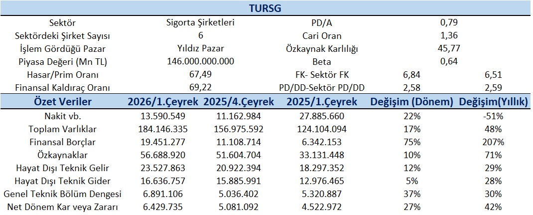 TURSG 2026’nın ilk çeyreğinde bir yıl önce aynı döneme göre karlılığını yaklaşık %42 artırarak enflasyonun üzerinde 6,43 Milyar TL’ye çıkartmıştır. 2025 yılının 4 çeyreğine göre net kâr ise yüzde %27 artmıştır. Özsermaye kârlılığı ise % 46 seviyesinde gerçekleşti. 2026/1 döneminde toplam brüt prim üretimi yıllık yüzde %29 ve dönemde %12 artışla 23,5 Milyar TL olurken; 2026 yılı toplam brüt prim üretimi yüzde 16 artışla 94 milyar TL seviyelerinde gerçekleşmesi beklenmektedir.