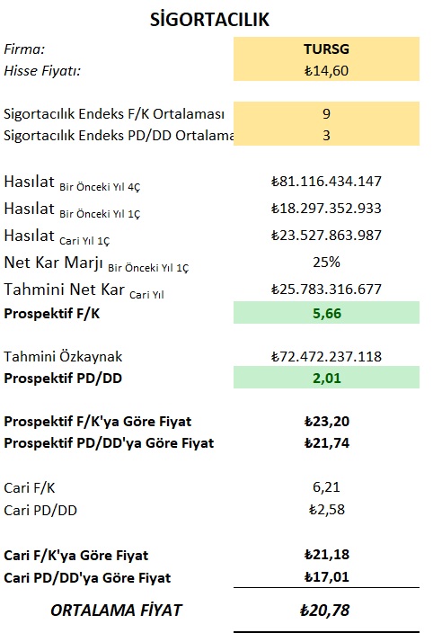 TURSG’nın son çeyrek 2026/1 verileri incelendiğinde sektör F/K oranın 6,51 olmasına karşılık 6,84 bir F/K’ya sektör PD/DD oranın 2,59 olmasına karşılık 2,58’lik bir PD/DD sahip olduğu gözlenmekte olup sektöre yakın hareket ettiğinin bir göstergesidir. Ayrıca Aswath Damodaran Avrupa bölgesindeki sigorta şirketlerinin (HAYAT DIŞI) ortalama fiyat kazanç oranının 23,76 ve beklenen F/K oranın ise 20,57 olarak tahmin edilmesi ile yine PD/DD oranı Avrupa şirketleri ortalaması 1,90 olup TURSG için daha önce verdiğimiz 15,64 TL hedef fiyatımızı 20,78 TL’ye güncelliyoruz…