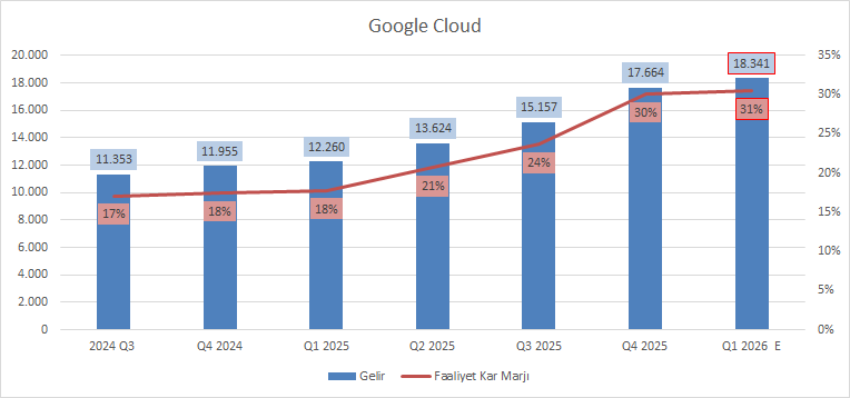 Google’un Cloud segmenti, toplam gelirden giderek daha fazla pay almaya devam etti. Segment, yıllık bazda gelirini %47,75 oranında büyüterek, 17,6 milyar dolar gelir üretti. Bu durum ile toplam gelirin %15,5’lik kısmını temsil etti. Ayrıca segmentin faaliyet kar marjı geçen yılın aynı dönemindeki %18 oranına göre %30’a yükselerek, operasyonel anlamda verimliliğini artıran bir eğilim çizdi. Piyasa Cloud segmentinin 18,3 milyar dolar gelir üretip (yıllık %49,6 büyüme), %31 oranında bir faaliyet kar marjı oluşturmasını bekliyor.