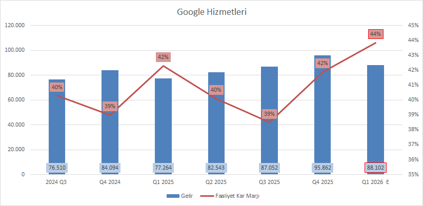 Google Hizmetler segmenti %42 oranında faaliyet kar marjı yaratarak, 2024 yılı dördüncü çeyreğindeki %39’luk marjı yukarı taşıdı ve operasyonel verimliliğin güçlendiğini gösterdi. Piyasa bu segmentin 2026 yılı ilk çeyreğinde %44 oranında bir faaliyet kar marjı yaratıp, 88,1 milyar dolar gelir üretmesini bekliyor.