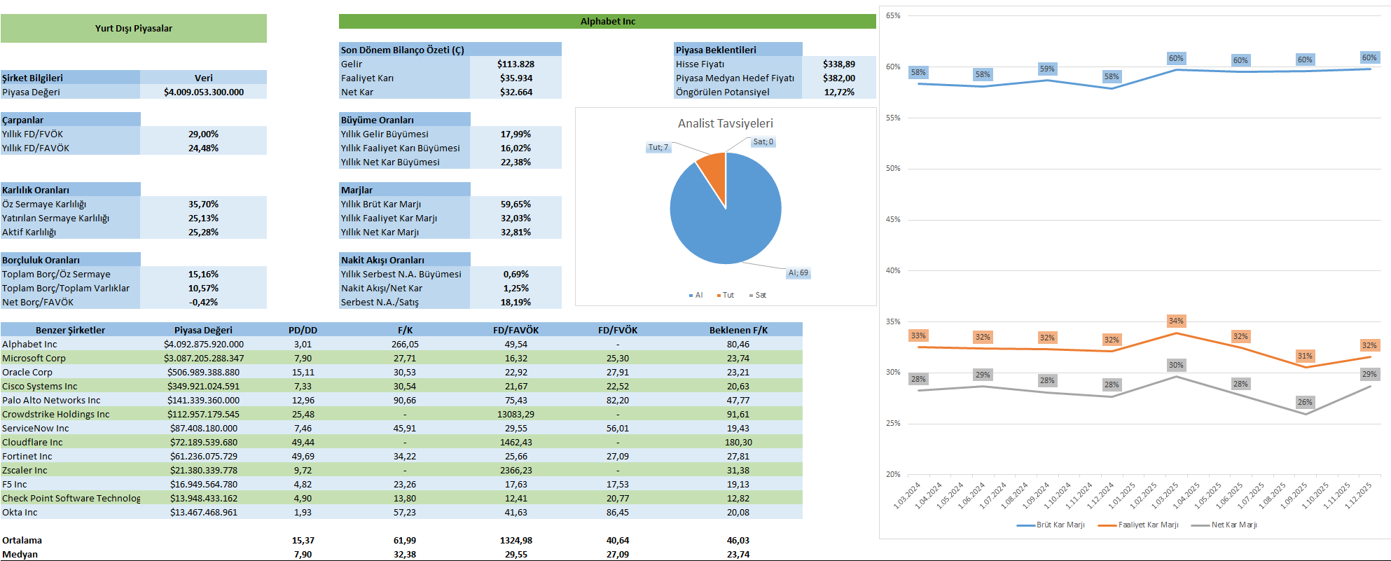Şirket bu finansal durum ile 4 trilyon doları aşan piyasa değeri ile işlem görüyor. Google, cari fiyatlarla hesaplanan F/K rasyosunda 266,05 çarpanla; FD/FAVÖK rasyosunda 36 çarpanla ve 80,46 çarpanlı beklenen F/K rasyosuyla, benzerlerinin medyan değeri üzerinde konumlanıyor.