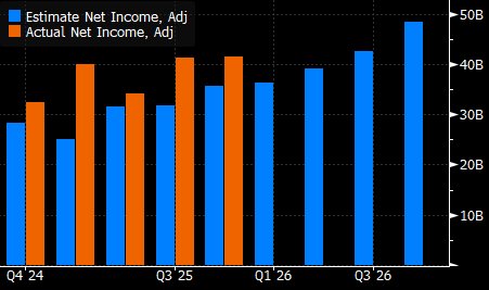 Net karın 36 milyar 240 milyon dolar ile sonuçlanması bekleniyor. Beklenti aralığı en yüksek 40,2 milyar dolar ve en düşük 30,2 milyar dolar tutarında yer buluyor.