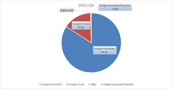 Google/Alphabet, dijital ekosistemin lider oyuncusu olarak temel faaliyetlerini arama motoru, YouTube, abonelik hizmetleri ve kurumsal bulut çözümleri üzerinden yürütmekte olup, gelirinin büyük çoğunluğunu Google Hizmetler segmenti (arama & diğer, YouTube reklamları ile abonelik ve cihaz gelirleri) oluşturuyor. Diğer yandan hızla büyüyen Google Cloud segmenti yapay zeka odaklı altyapı ve çözümleriyle ikinci ana gelir kaynağı haline geliyor. Son çeyreklik dönem itibariyle şirketin gelirinin %84’ünü Google Hizmetleri oluştururken; %15’ini Google Cloud temsil ediyor.