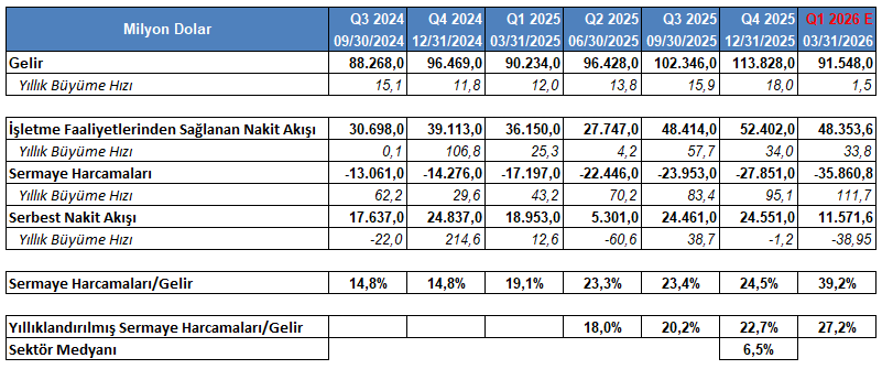 Bu dönemde Google, işletme faaliyetlerinden 52,4 milyar dolar nakit akışı sağlarken, bu akış %34 oranında büyüdü. Sermaye harcamaları ise %95 oranında büyüyerek, 27,8 milyar doları aştı. Buradan hareketle serbest nakit akışı 24,5 milyar dolar tutarında elde edilirken, yıllık bazda %1 oranında daralma görüldü. Google’ın gelirine oranla sermaye harcamaları, benzerlerine kıyasla yüksek kalmaya devam etti. Piyasa sermaye harcamalarının %111 oranında artmasını, serbest nakit akışının %39 oranında daralmasını bekliyor.