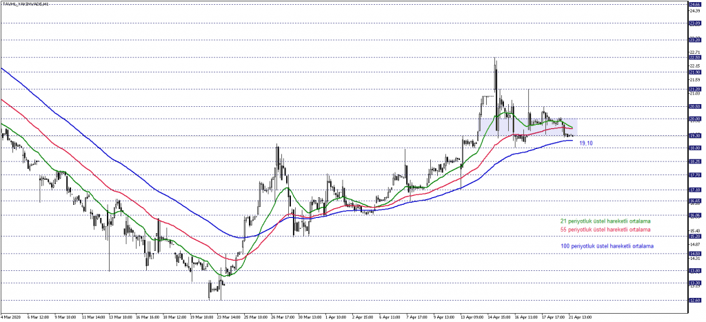 TAVHL yakın vade sözleşmesini kısa vadede teknik olarak değerlendirdiğimizde, 21 ve 55 periyotluk üstel hareketli ortalamaların desteklediği 19,30 – 20,00 bölgesini takip etmekteyiz. Fiyat 19,30 – 20,00 bölgesi içerisinde oluşmayı sürdürdükçe, karar aşaması geçerli olabilir.