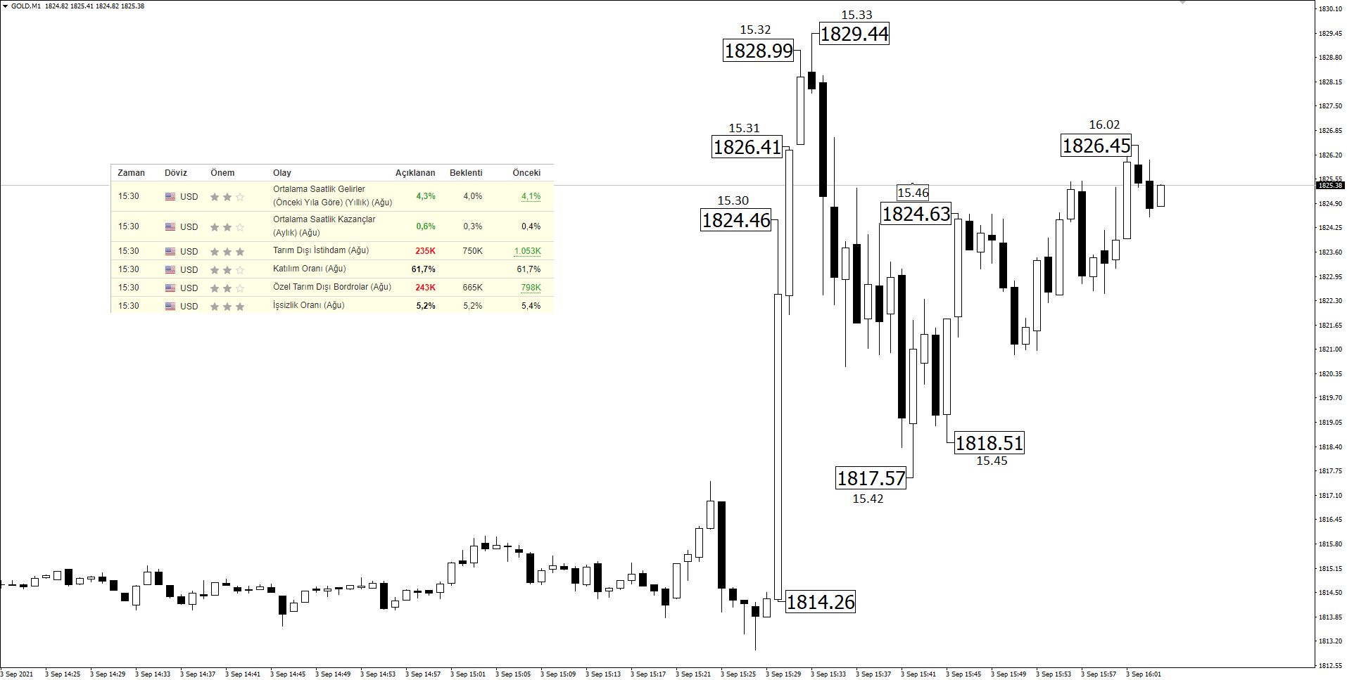 03 Eylül 2021 tarihinde yani bir önceki ay açıklanan ABD verileri ile birlikte EURUSD (yukarıdaki grafik) ve Ons Altın (aşağıdaki grafik) ilk dakika fiyatlama davranışında önemli bir yükseliş izlemekteyiz. Ancak bu yükseliş ikinci dakikadan itibaren hacimsel anlamda sınırlanmakta hatta daha sonraki dakikalarda davranış biçimi değişmektedir. Bu süreç, mevcut haberin açıklandığı anın ne kadar önemli olduğunu ve haberin sonucunun yorumlanmasında zamana endeksli değişimlerin önemini artırmaktadır. Bu nedenle veriye hızlı bir şekilde ulaşmak ve ilgili veriyi doğru bir şekilde yorumlamak kritik bir önem taşımaktadır. “GCM Forex / Viop / Borsa Yatırımcıları”, verilerin sonucuna ilişkin GCM MT4 / GCM MT5 platformları içerisinde yer alan ve anlık olarak veri akışının geçtiği “Haberler” bölümünden yararlanabilir.