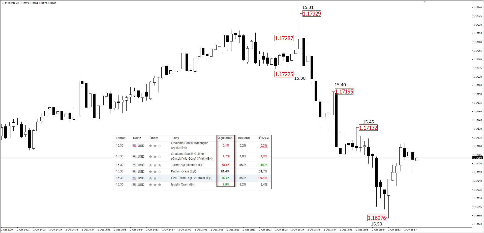 02 Ekim 2020 tarihinde yani bir önceki yılın aynı ayında açıklanan ABD verileri ile birlikte EURUSD ilk dakika fiyatlama davranışında önemli bir yükseliş izlemekteyiz. Ancak bu yükseliş ikinci dakikadan itibaren hacimsel anlamda sınırlanmakta hatta daha sonraki dakikalarda davranış biçimi değişmektedir. Bu tutum, mevcut haberin açıklandığı anın ne kadar önemli olduğunu ve haberin sonucunun yorumlanmasında zamana endeksli değişimlerin önemini artırmaktadır. Bu nedenle veriye hızlı bir şekilde ulaşmak ve ilgili veriyi doğru bir şekilde yorumlamak kritik bir önem taşımaktadır.
