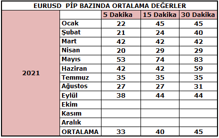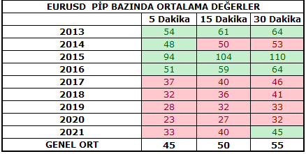 105 tane veri (8 yıl + 9 ay) sonucunun EURUSD paritesi üzerindeki etkisini incelediğimizde 5 dakika içerisinde ortalama 45 pip, 15 dakika içerisinde ortalama 50 pip ve 30 dakika içerisinde ortalama 55 pip hareket ettiğini, 5 ile 30 dakika arasındaki ortalama değerler incelendiğinde önemli bir pip farkının olmadığını ve bu nedenle de özellikle istihdam verilerinin ilk 5 dakika üzerindeki olası etkisinin çok daha önemli olduğunu söyleyebiliriz.