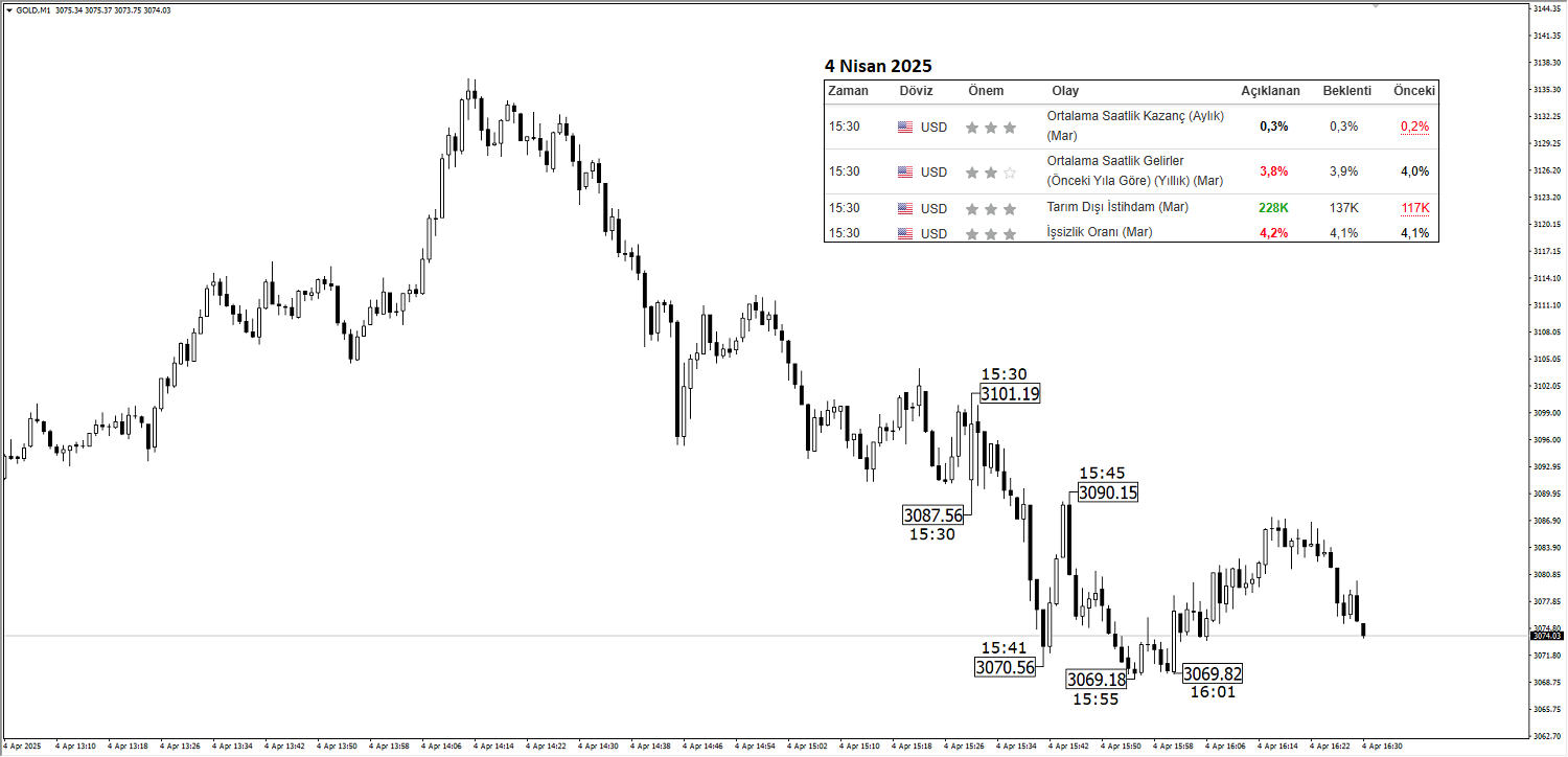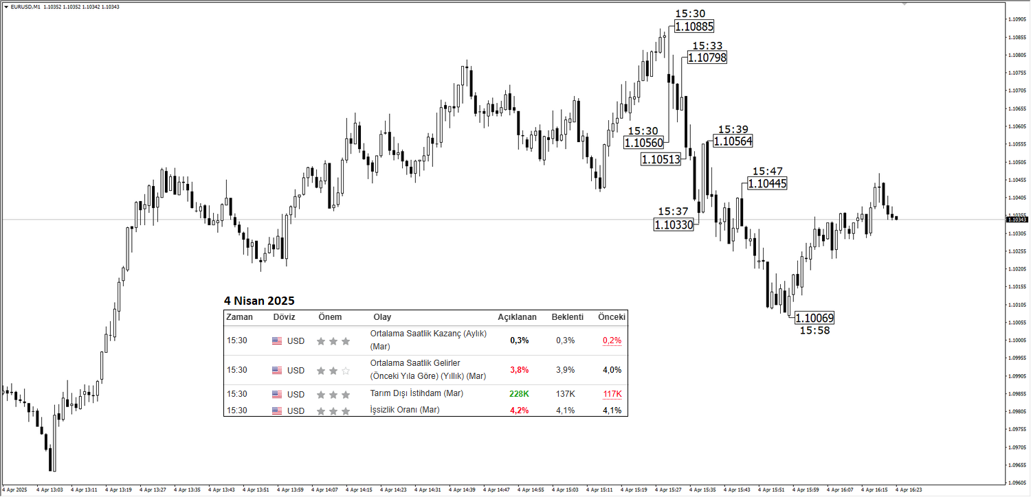 4 Nisan 2025 tarihinde yani bir önceki yılın aynı ayında açıklanan ABD verileri ile birlikte EURUSD ve Ons Altın fiyatlarında ilk etapta dalgalı genel itibariyle de negatif bir seyir gözlenmiştir. İlk etapta İşsizlik Oranı verisinin yükselişi varlık fiyatlarının anlık reaksiyonunda öncü olmakla birlikte tarım dışı istihdam verisinin güçlü seyri, Altın ve EURUSD düşüşünün devamlılığında öncü bir rol oynamıştır.